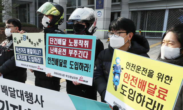 배달노동자 노조인 라이더유니온 부산경남지부는 28일 부산시청 광장에서 현행 배달료 체계의 문제점을 지적하고 안전 배달료 도입을 요구하는 기자회견을 열었다.