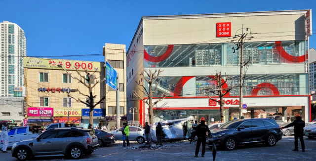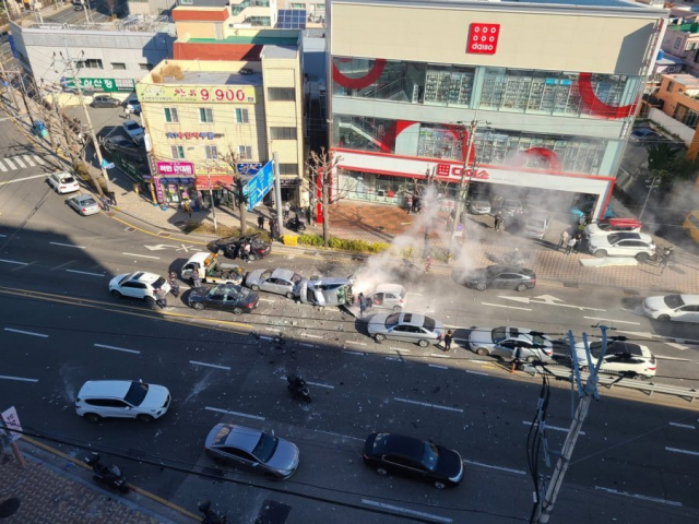 30일 부산 연제경찰서와 부산소방재난본부에 따르면, 이날 낮 12시 30분께 부산 연제구 홈플러스 5층 주차장에서 70대 운전자 A 씨가 몰던 SM5 택시가 건물 외벽을 뚫고 외부로 추락, 도로에서 신호 대기 중이던 차량 14대를 잇따라 충격했다.