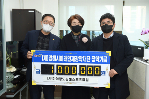 김해시미래인재장학재단(이사장 현종원)은 31일 (사)가야왕도김해스포츠클럽(회장 류정옥)에서 장학기금 100만원을 기탁했다고 밝혔다.