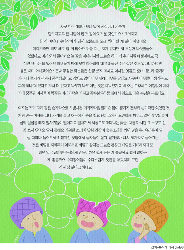 자꾸 이야기하다 보니 말이 생깁니다 기분이 달라지고 다른 사람이 된 것 같아요 기분 탓인가요? 그러자고 한 건 아닌데 수다장이가 돼서 오물조물 오래 씹어 쉴 새 없이 꺼냈어요 이야기라면 해도 해도 할 게 많아요 귀를 여는 자가 없다면 저 무성한 나뭇잎들이 있잖아요 이리 와서 들어봐요 늘 같은 이야기지만 오늘은 하나 더 추가시킬 예정이에요 극적인 요소는 늘 있어요 마녀들이 밤에 모여 항아리에 대고 떠들던 주문 같은 것도 있다니까요 인생은 재미 아니겠어요? 문밖 무성한 화분들은 신경 쓰지 마세요 이야길 엿듣고 흉내 내느라 줄거리가 아니 줄기가 생겨서 풍성해졌어요 염치도 없이 나무 옆에 나무를 낳네요 자꾸만 나무들이 생기는 오후에 하나 더 있다고 하나 더 없다고 나무가 나무 아닌 것은 아니겠지요 비 오는 오후에도 어김없이 이야기에 중독된 여자들이 똑같은 머리카락을 가지고 감수분열하듯 옆에서 옆으로 다음 손님을 부르네요