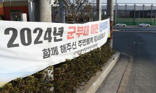부산 사하구 구평동 도로에 예비군훈련장 이전을 환영하는 주민들의 현수막이 걸려 있다.