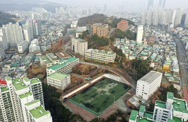 9일 오후 부산 남구 구 부산외국어대학교 전경. 김종진 기자 kjj1761@부산 남구 우암동 옛 부산외대 부지를 사들인 민간 사업자가 1300세대 규모 민간 아파트 건설을 뼈대로 하는 개발 계획안을 최근 부산시에 제출한 것으로 확인됐다. 당초 부산시가 계획했던 공공 복합타운 공영개발과 달리 민간 사업자의 이익만을 위한 아파트 단지로 전락할 수 있다는 우려의 목소리가 높아진다. 이에 따라 부산시가 향후 진행될 사전협상 과정에서 공공성 고수 원칙을 확실하게 지켜 나가야 한다는 주문이 나온다.