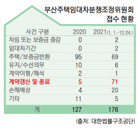 10일 대한법률구조공단에 따르면 지난해(1월 1일~12월 24일) 부산지역 주택임대차분쟁조정위원회(이하 조정위)에 접수된 분쟁은 176건인데, 이 중 계약갱신 관련 분쟁이 총 71건으로 가장 높은 비중을 차지했다. 이어 보증금 반환(69건), 손해배상(20건) 순이다. 계약갱신 관련 분쟁은 2019년 3건, 2020년 5건에 불과했으나 지난해에는 전년 대비 14배나 증가했다. 2020년 7월 임차인이 전월세 계약의 갱신을 요구할 수 있는 계약갱신청구권과 임대료 5% 내에서 인상 가능하도록 한 전월세상한제가 시행되면서 관련 분쟁이 폭증한 것으로 분석된다. 임대차 3법은 계약갱신청구권과 전월세상한제, 전월세신고제를 일컫는다.