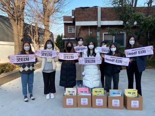 동명대학교(총장 전호환) 유아교육과 동아리 ‘굿티처’(회장 장수연)는 최근 부산 새빛기독보육원에 직접 제작한 놀이키트를 전달했다. 굿티처 장수연 회장은 “코로나19 장기화로 아이들을 만나기 힘든 상황에서 재능 기부를 하게 돼 기쁘다”고 말했다. 김상훈 기자
