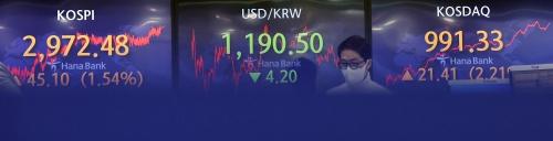 12일 코스피 지수는 전 거래일보다 45.10포인트(1.54%) 오른 2972.48에 거래를 마쳤다. 이날 코스피 지수는 전장보다 23.40포인트(0.80%) 상승한 2950.78에서 출발해 강세 흐름을 지속했다. 코스닥지수도 전장보다 21.41포인트(2.21%) 높은 991.33으로 마감했다.