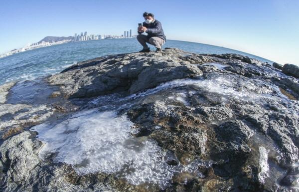 12일 오전 부산 남구 이기대공원 갯바위에 바닷물이 얼어붙어 매서운 한파를 실감케 하고 있다. 기상청은 14일까지 영하권의 맹추위가 계속될 것으로 예보했다. 김종진 기자 kjj1761@