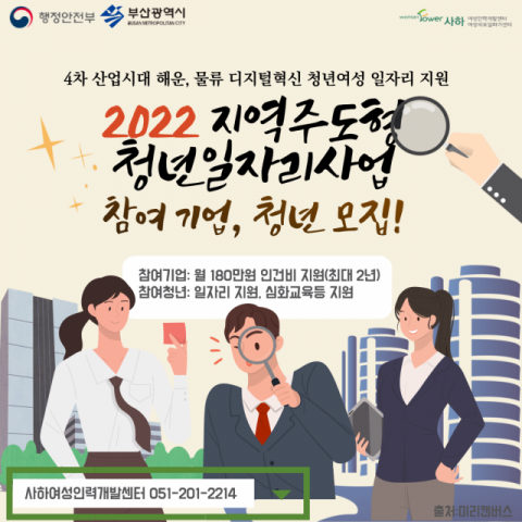 사하여성인력개발센터(관장 김희경)는 10일부터 21일까지 행정안전부 지역주도형 청년일자리사업 '4차 산업시대 해운∙물류 디지털혁신 청년여성 일자리 지원사업'에 참여할 기업 11개소를 모집한다.