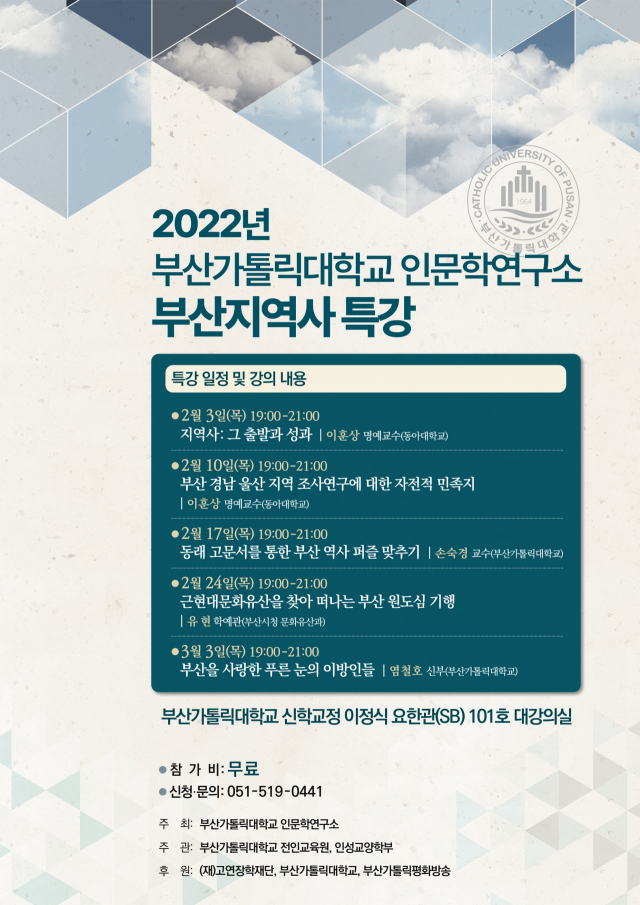 부산가톨릭대(총장 홍경완 신부) 인문학연구소(소장 염철호 신부)가 오는 2월 3일부터 3월 3일까지 매주 목요일 ‘2022년 부산지역사 특강’을 무료로 개최하고 수강을 원하는 참가자를 모집한다.