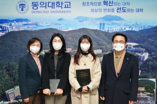 동의대 대학원(원장 김세환)은 최근 어머니 임영제(왼쪽 두 번째) 박사와 딸 김찬아(왼쪽 세 번째) 석사가 논문심사를 통과, 오는 2월에 모녀 석·박사가 동시에 배출된다고 밝혔다.