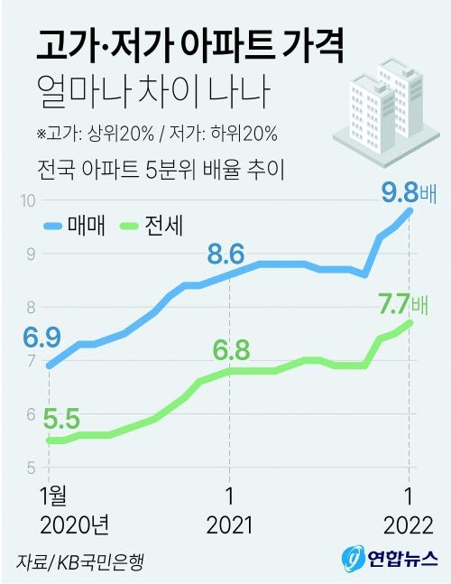 24일 KB국민은행의 월간 주택시장동향 시계열 통계에 따르면 이달 전국 아파트 5분위 배율은 매매 9.8, 전세 7.7로 집계됐다. 이는 2008년 12월 관련 월간 조사가 시작된 이래 역대로 가장 높은 수치다.