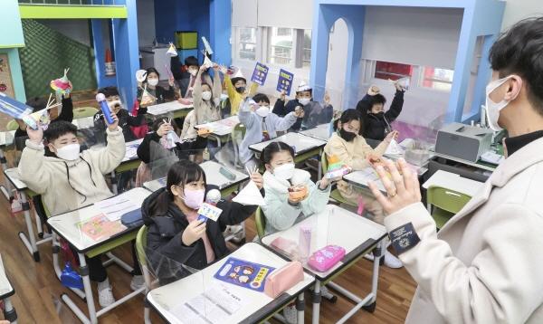 겨울방학이 끝나고 첫 등교가 시작된 24일 오전 부산 남구 석포초등학교에서 마스크를 착용한 학생들이 안전 가림막이 설치된 교실에서 선생님과 친구들에게 인사를 하고 있다. 김종진 기자 kjj1761@