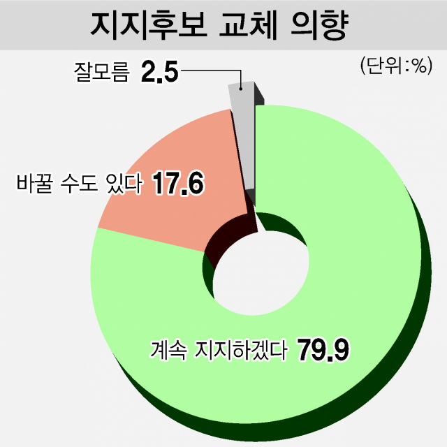 <부산일보> 등 한국지방신문협회 소속 9개 언론사가 공동으로 조원씨앤아이에 의뢰해 지난 20~23일 전국 만 18세 이상 남녀 3013명을 대상으로 조사한 결과(신뢰수준 95%에 표본오차는 ±1.8%포인트(P)), ‘현재 지지하는 후보를 앞으로 계속 지지하겠느냐’는 질문에 79.9%는 계속 지지하겠다고 응답했다. 이어 ‘바꿀 수 있다’ 17.6%, ‘잘모름’ 2.5% 순이었다.