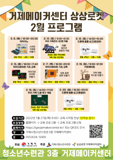 교육 신청 및 문의는 거제메이커센터 홈페이지와 거제메이커센터에서 가능하며 오는 1월 27일 오전 9시부터 신청이 가능하다.