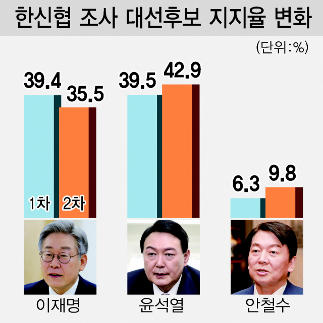 <부산일보>를 포함해 전국 9개 권역 메이저 지역 언론이 소속된 한신협 의뢰로 여론조사업체 조원씨앤아이가 지난 20~23일 전국 만 18세 이상 남녀 3013명을 상대로 조사한 결과(표본오차는 95% 신뢰수준에 ±1.8%P)에 따르면 윤 후보는 1차 조사 때보다 3.4%P 오른 반면, 이 후보는 3.9%P 낮아져 지지율 격차가 7.4%P까지 벌어졌다.