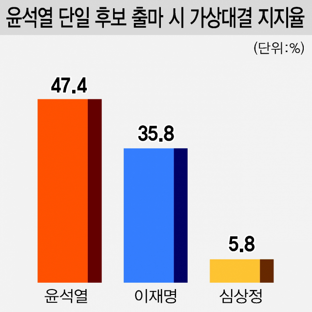 윤석열·안철수 후보 모두 보수 단일화가 이뤄지면 지지율이 높아지는 것으로 나타났다. 단일화 시너지가 적지 않다는 의미다. 단일화는 대선 승리라는 공식이 성립 가능할 정도다. 윤 후보로 단일화할 경우 3자 가상대결에서는 윤석열 47.4%, 이재명 35.8%, 정의당 심상정 5.8%로 집계됐다. 안 후보를 포함한 4자 대결시 윤 후보 지지율 42.9%보다 단일화를 가정했을 때 4.5%P 상승하는 셈이다.