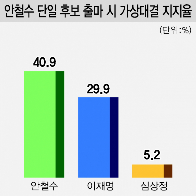 안 후보 지지율 변화는 더 극적이다. 안 후보는 4자 대결에서 9.8%의 한 자릿수 지지율을 기록했지만, 보수 단일후보가 되면 40.9%를 기록, 이 후보(29.9%)에 11.0%P 앞선 것으로 집계됐다. 심 후보는 5.2%로 나타났다.