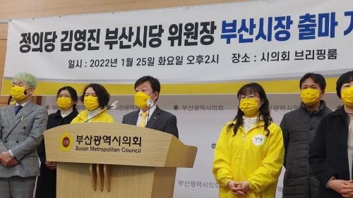 김영진 정의당 부산시당 위원장이 25일 부산시의회에서 기자회견을 열고 6·1 부산시장 선거 출마를 선언했다. 정의당 제공김영진 정의당 부산시당 위원장이 올해 6·1 부산시장 선거 출마를 선언했다. 여야 통틀어 부산시장 선거에 뛰어든 첫 주자다.