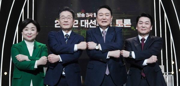 제20대 대통령 선거 후보 4자 TV토론회가 3일 오후 서울 여의도 KBS 스튜디오에서 지상파 방송 3사 합동 초청으로 열렸다. 왼쪽부터 정의당 심상정, 민주당 이재명, 국민의힘 윤석열, 국민의당 안철수 후보가 토론에 앞서 선전을 다짐하고 있다. 김종호 기자 kimjh@