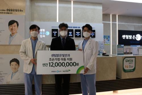 부산 해운대구 센텀밝은빛안과(대표원장 차영동·박영민)는 최근 초록우산 어린이재단 부산지역본부(본부장 노희헌)에 연간 1200만 원의 후원금을 지원했다. 이 후원금은 부산지역 조손가정 아동들의 학습비와 양육비로 사용된다. 센텀밝은빛안과 차영동 대표원장은 “코로나19 장기화로 저소득가정 아동이 더욱 힘들다”며 “정기적인 후원을 통해 조손가정이 양육 부담을 덜고, 희망을 갖기를 바란다”고 밝혔다. 김상훈 기자