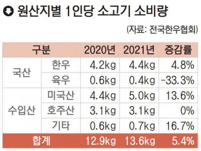 7일 전국한우협회에 따르면 2021년 우리나라 국민의 1인당 소고기 소비량은 13.6kg로, 이 가운데 제일 큰 비중은 미국산(5kg)으로 국산육 전체 4.8kg보다 0.2kg가 많았다. 또 한우 소비량(4.4kg)보다도 0.6kg이 많았다. 국산육이란 한우와 육우를 합한 것이다.