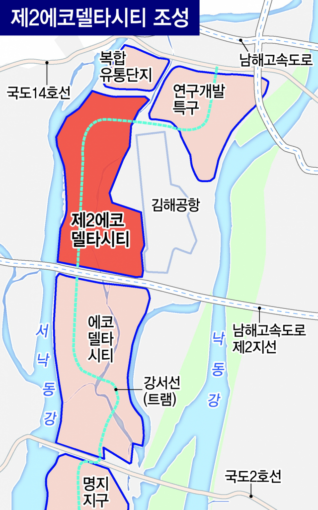 부산시는 제2 에코델타시티가 조성되면 주변 개발지와 함께 부산의 새로운 발전 축이 될 것이라고 보고 있다. 이 지역 남쪽으로 명지국제신도시, 에코델타시티가 들어서고 있고 북으로는 연구개발특구가 계획돼 있어 부산 강서구에 신도시급 4개 지역이 남북으로 이어져 하나의 발전 축이 되는, 연담도시화 효과가 있을 것이라는 게 부산시 설명이다. 또 지역균형발전을 견인할 부울경 메가시티 핵심 거점도 될 것으로 보고 있다. 박 시장은 “강서구의 변모 과정이 1960~80년대 서울 강남 개발과 매우 유사하다”며 “제2 에코델타시티 추진이 성공한다면 강서를 비롯한 서부산권이 서울 강남 못지않은 글로벌 거점으로 변화할 수 있다”고 강조했다.