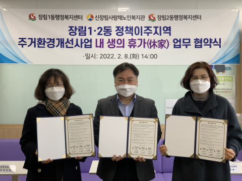 부산 사하구(구청장 김태석) 신장림사랑채노인복지관(관장 김동현)은 8일 장림1·2동 정책 이주지 내 거주하는 주거취약 어르신들을 위한 주거환경개선 프로그램 ‘내 생의 휴가(休家)’사업을 진행하기 위해 장림1동, 장림2동 행정복지센터와 업무협약을 체결하였다.