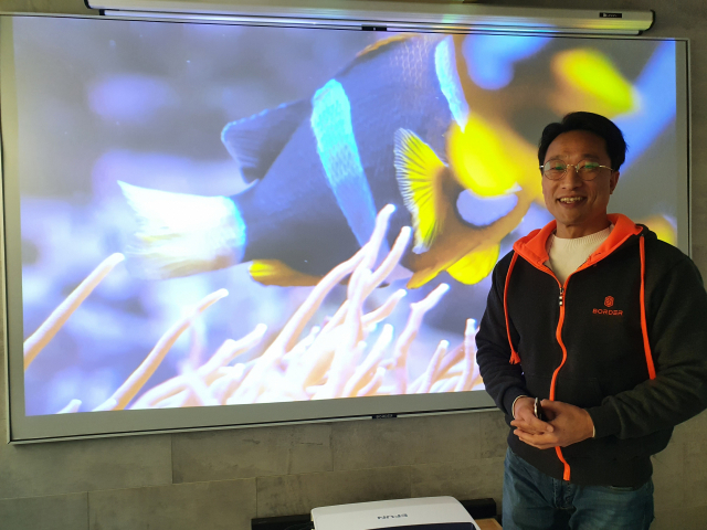 김 대표는 본사에서 자사 제품의 성능을 보여주기 위해 빔프로젝터를 켜고 스크린에 영상을 띄웠다. 사무실 조명과 자연광에도 화면이 선명했고, 화면 측면에서 봐도 영상이 잘 보였다. 스크린 두께가 15mm에 불과하다는 점도 놀라웠다. 보통 사무실에서 쓰는 빔프로젝터 스크린의 경우 원단으로 만들어 말아 올릴 수 있는 장점이 있지만, 조명을 켜거나 측면에서 보면 화면이 잘 안 보이는 경우가 많다.