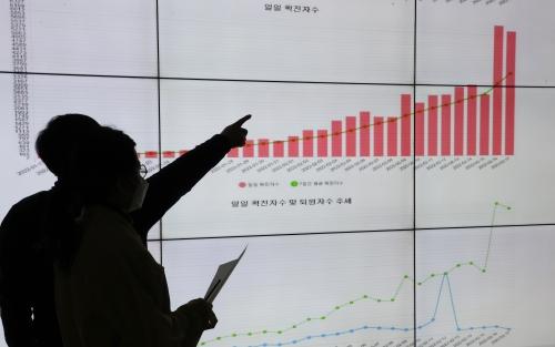 17일 부산시청 재난상황실에서 직원들이 가파르게 치솟은 확진자 추이 그래프를 살펴보고 있다.