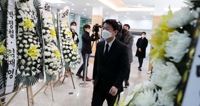 이재명 더불어민주당 후보와 윤석열 국민의힘 후보의 대선 양강 구도가 점차 굳어지는 추세다. 안철수 국민의당 대선 후보가 17일 유세 버스 사고로 숨진 고(故) 손평오 논산·계룡·금산 지역선대위원장의 빈소가 마련된 천안 단국대병원 장례식장으로 들어오고 있다. 연합뉴스