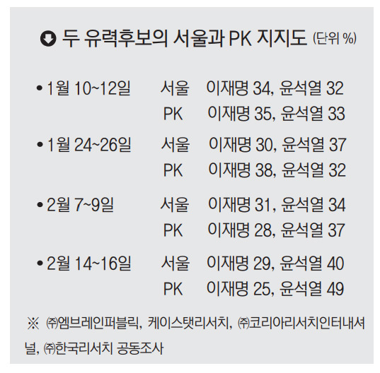 엠브레인퍼블릭·케이스탯리서치·코리아리서치·한국리서치 등 여론조사 4사가 14~16일 실시한 ‘전국지표조사(NBS)’에서 서울과 PK의 대선후보 당선 가능성이 거의 비슷했다. 윤 후보는 서울(55%)과 PK(54%)의 당선 가능성이 거의 같았고, 이 후보 역시 서울(25%)와 PK(29%)가 비슷했다. 윤·이 두 후보의 전국 평균 당선 가능성(윤석열 48%, 이재명 32%) 차이보다 서울·PK에선 더 벌어진 것이다.