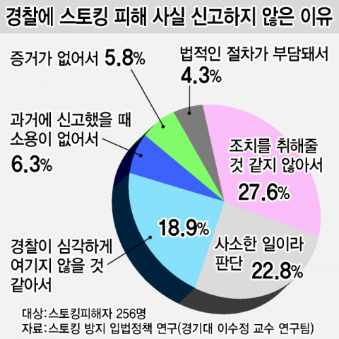 경기대 이수정 교수 연구팀이 지난해 12월 국회에 제출한 ‘스토킹 방지 입법정책 연구’ 보고서에 따르면 스토킹 피해자 256명 중 206명(80.5%)이 경찰에 스토킹 피해 사실을 신고하지 않았다. 그 이유로는 ‘별다른 조치를 취해 줄 것 같지 않아서’(27.6%), ‘사소한 일이라 생각돼서’(22.8%), ‘경찰이 심각하게 여기지 않을 것 같아서’(18.9%), ‘과거에 신고했을 때 소용이 없어서’(6.3%) 등을 꼽았다.