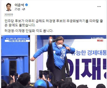 이날 이준석 국민의힘 대표는 페이스북을 통해 이 후보의 발차기 퍼포먼스에 대해 "민주당 후보가 아무리 급해도 허경영 후보의 무궁화 발차기를 따라할 줄은 꿈에도 몰랐다"며 "허경영-이재명 단일화 각도 본다"고 비꼬았다.