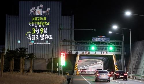 부산 도시고속도로 광안터널 입구 외벽에 부산시선관위가 설치한 투표참여 홍보 그림자 조명이 눈길을 끌고 있다. 그림자조명은 대통령선거일 전날인 3월 8일까지 광안, 백양, 황령, 만덕2터널 입구 외벽에서 확인할 수 있다. 강선배 기자 ksun@