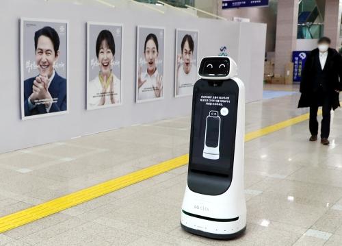 LG전자가 지난해 말 부산세계박람회 홍보활동을 위해 부산시에 제공한 안내로봇 ‘LG 클로이 가이드봇’이 시청 청사에서 시민들을 만나고 있다. 강선배 기자 ksun@LG전자는 미국 뉴욕 타임스스퀘어와 영국 런던 피카딜리광장에서 운영하고 있는 자사 전광판에 현지시간 18일부터 ‘2030 부산세계박람회’ 유치를 위한 홍보영상을 다음 달 말까지 상영한다고 21일 밝혔다.