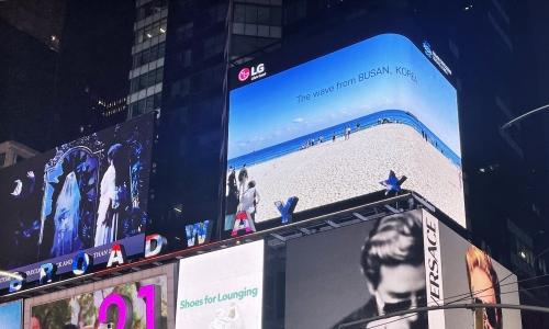 LG전자가 미국 뉴욕 타임스스퀘어 전광판에 해운대해수욕장을 소재로 한 ‘2030 부산세계박람회’ 유치 홍보영상을 송출하고 있다. 다음 달 말까지 상영될 예정인 이 영상을 통해 부산의 아름다운 이미지와 부산세계박람회 유치 의지를 널리 알릴 수 있을 것으로 보인다. ▶관련 기사 8면 LG전자 제공