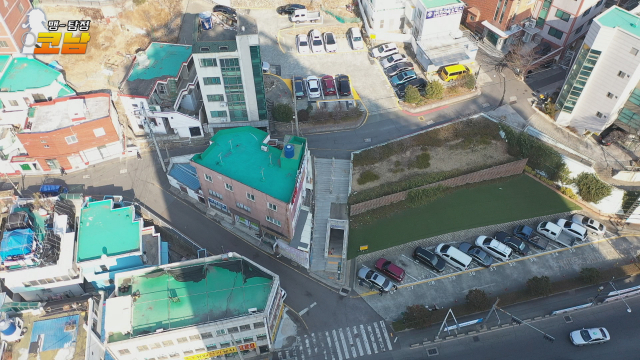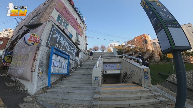 계단과 도시철도 출입구가 맞닿아 있는 부분을 주의 깊게 살폈다. 처음부터 한 몸(?)으로 설계되어 만들어졌다는 느낌은 없다. 시멘트 색·재질이 서로 달랐다. 억지로 두 계단을 붙여놓았다. 맹탕정 일행이 지상으로 올라오기 위해 걸었던, 유난히 길었던 통로 구간. 그 지상에는 옹벽 위 주민들을 위한 지정 주차장이 들어서 있다. 주차장을 만들기 위해 출입구를 멀리 놓은 걸까? 그렇다고 계단을 파서 만들건 무슨 이유인가? 궁금해졌다. 둘 중 뭐가 먼저 생겼을까?