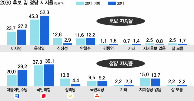 국민의힘 윤석열 대선후보가 3·9 대선 최대 격전지 부산의 2030세대 지지율에서 더불어민주당 이재명 후보와의 격차를 20%포인트(P)(20대 21.6%P, 30대 25.1%P)까지 벌리며 앞선 것으로 21일 나타났다. 다만 2030층은 다른 연령에 비해 제3지대 후보에 대한 선호도가 높았다. 양강 구도를 형성하는 이재명, 윤석열 후보에 대한 높은 비호감도가 반영된 것으로 풀이된다.