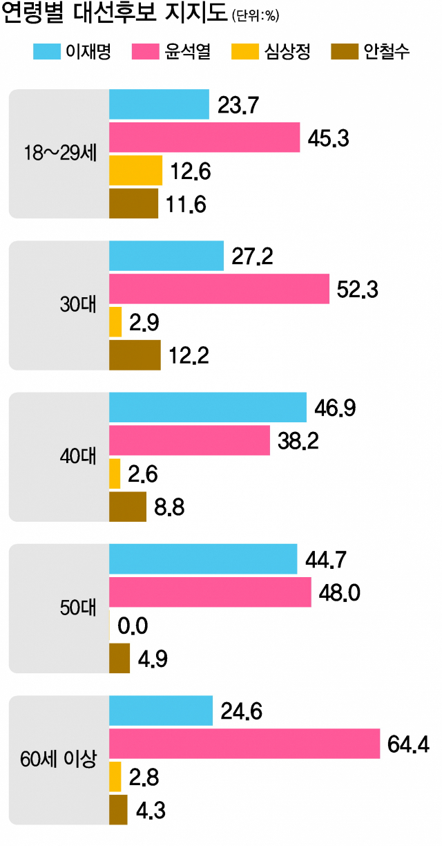 이번 조사에서 눈여겨볼 대목은 연령별 지지율이다. 윤 후보는 18~29세(윤 45.3%, 이 23.7%), 30대(윤 52.3%, 이 27.2%), 60세 이상(윤 64.4%, 이 24.6%)에선 이 후보를 배 이상 앞섰지만, 40대(이 46.9%, 윤 38.2%)에선 이 후보가 훨씬 높았고, 50대에선 이 후보(44.7%)와 윤 후보(48.0%)의 지지율이 큰 차이가 없었다.