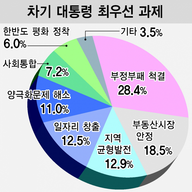 <부산일보>·한국사회여론연구소(KSOI)가 지난 19~20일 실시한 부산 지역 여론조사(1000명 대상)에서 차기 대통령의 최우선 과제를 묻는 질문에 28.4%가 부정부패 척결을 1순위 과제로 선택했다. 이어 ‘부동산 시장 안정’ 18.5%, ‘지역균형발전’ 12.9%, ‘일자리 창출’ 12.5%, ‘양극화 해소’ 11.0%, ‘사회 통합’ 7.2%, ‘한반도 평화 정착’ 6.0% 등이 뒤를 이었다.