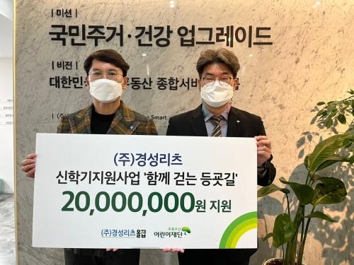 (주)경성리츠(대표 채창일·왼쪽)는 22일 초록우산 어린이재단 부산지역본부(본부장 노희헌·오른쪽)를 통해 신학기지원사업에 2000만 원을 후원했다.