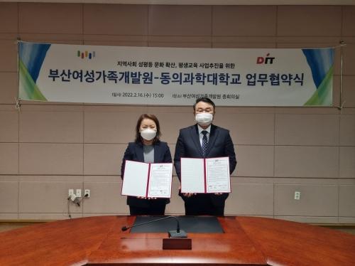 동의과학대학교(총장 김영도·오른쪽)와 부산여성가족개발원(원장 오경은·왼쪽)은 지난 16일 ‘지역사회 성평등 문화 확산과 평생교육 사업 추진을 위한 업무협약’을 체결했다. 김영도 총장은 “양 기관의 긴밀한 상호협력을 바탕으로 평생교육 사업 활성화와 함께 지역사회 내 올바른 성인식 문화 정착을 위해 노력하겠다”고 말했다. 임원철 선임기자
