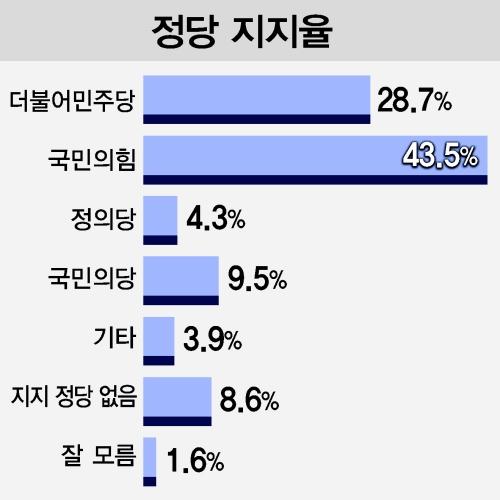정당 지지율은 △더불어민주당 28.7% △국민의힘 43.5% △정의당 4.3% △국민의당 9.5% △기타 정당 3.9% △지지정당 없음 8.6% △잘 모름 1.6%였다. 연령대별 정당 지지율은 40대를 제외하고는 모든 연령층에서 국민의힘이 가장 앞섰다. 40대에서만 민주당 37.8%, 국민의힘 33.6%로 여당이 4.2%포인트(P) 높았다. 국민의당은 18~29세와 60세 이상에서 각각 11.5%, 11.3%로 두자릿 수 지지율을 기록했다. 구·군별 정당 지지율은 5개 구·군 모든 지역에서 국민의힘이 앞섰다. 북구에서만 민주당 32.3%, 국민의힘 35.5%로 엇비슷한 수준이었다.