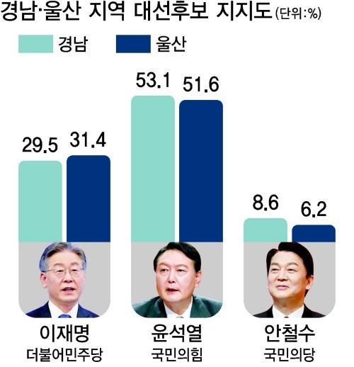 <부산일보>가 한국사회여론연구소(KSOI)에 의뢰해 지난 19~20일 성인 1802명(경남 1001명, 울산 801명)을 대상으로 실시한 대선 여론조사에서 윤, 이 후보 지지율은 경남 53.1% 대 29.5%, 울산 51.6% 대 31.4%로, 윤 후보가 오차범위 밖에서 앞섰다. 국민의당 안철수 후보는 두 지역에서 각각 8.6%·6.2%를 얻었고, 정의당 심상정 3.2%·3.8%, 새로운 물결 김동연 0.4%·0.5%, 기타 후보가 1.5%·2.3% 등으로 뒤를 이었다. ‘지지후보 없음/잘 모름’으로 응답한 부동층은 3.7%·4.2%로 나타났다.