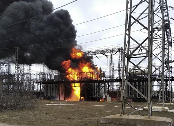 22일(현지시간) 우크라이나 동부 루간스크 스차스티예 지역에서 포격으로 피해를 입은 화력발전소에서 화염과 연기가 치솟고 있다. AP연합뉴스연합뉴스