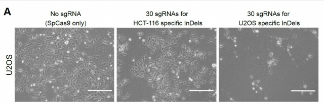 그림. CINDELA의 암세포 특이적 사멸. HCT-116(결장암 세포) 및 U2OS(골육종 세포)의 전체 게놈 서열 결정을 통해, 이들 암세포에 공통으로 존재하는 InDel 돌연변이들을 찾아냈다. 연구진은 U2OS에서 발견한 InDel 돌연변이들을 표적하는 유전자 가위를 제작해 U2OS 세포에 전달했을 때 U2OS 세포만을 죽임을 확인했다. CINDELA 기술이 암세포를 맞춤형으로 사멸시킬 수 있음을 입증한 것이다. IBS 제공