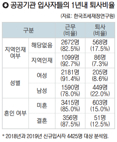 이에 연구는 38개 공공기관의 2018~2019년 입사자 4425명의 자료를 분석했다. 이들 중 1년내 퇴사한 사람은 14.8%인 654명이었다. 이 가운데 지역인재 중 퇴사자는 86명(7.3%)이었고 비 지역인재 중에선 568명(17.5%)에 달했다.