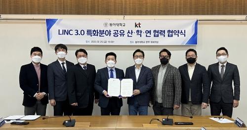 동아대학교(총장 이해우)는 KT부산경남광역본부(본부장 김봉균)와 지난달 25일 동아대 승학캠퍼스 대회의실에서 ‘LINC 3.0 특화분야 공유 산·학·연 협력 협약식’을 체결했다.