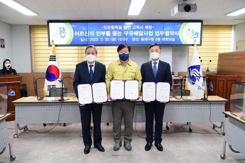 부산 동래구청(구청장 김우룡)은 최근 부전교회, (사)‘어르신의 안부를 묻는 우유배달’과 어르신의 안부를 묻는 우유배달 사업 추진을 위한 업무 협약을 체결했다.