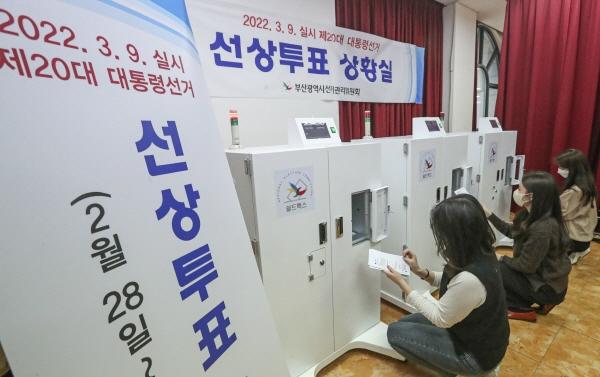 제20대 대통령선거 선상투표가 시작된 1일 부산시 선거관리위원회 상황실에서 직원들이 선상투표지를 접수하고 있다. 선상투표는 선박에서 기표한 투표용지를 팩스로 보내면 타인이 보지 못하도록 봉투에 담겨 출력되는 ‘실드팩스’로 수신돼 구·군 선관위에 전달된다. 김종진 기자 kjj1761@