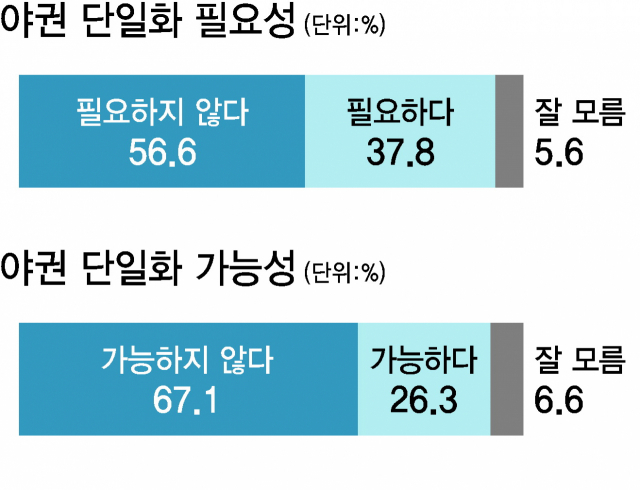 <부산일보>와 한국지방신문협회가 조원씨앤아이에 의뢰해 지난달 26일부터 이달 1일까지 전국 18세 이상 남녀 3004명을 대상으로 조사한 결과(표본오차는 95% 신뢰수준에 ±1.8%포인트(P)), ‘야권 단일화가 필요하지 않다’가 56.6%로 ‘필요하다’(37.8%) 보다 18.8%포인트(P) 높았다. 야권 후보 단일화 시 불리한 위치에 놓이는 더불어민주당(83.7%), 정의당(77.7%) 지지층에서 부정적인 여론이 높았다.